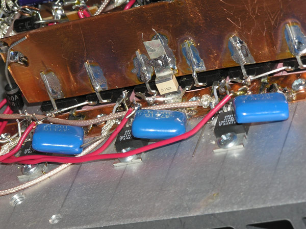 The shunt capacitors are way over at one end of the drain bus.  They should be in the middle, or use 2 capacitors of 1/2 the total value and put one at each end.  For 160 meters, you can add additional shunt capacitance at the end, as long as this is not the total capacitance of the shunt capacitor.