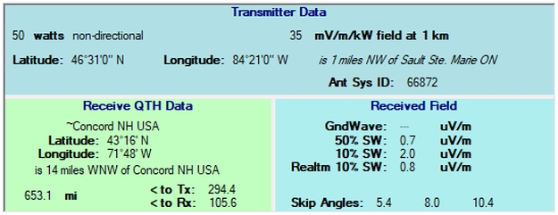 Using FCC methods, below are the nighttime skywave fields expected for a similar path length from a