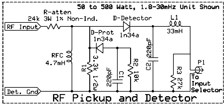 R-Atten shown - 24k - is for a 50 to 500 watt RF pickup unit.  If you need lower power, use a lower value of R-Atten, or for higher power use a higher R-Atten.  I don't know why I put a 1% resistor in the schematic.  The value is not critical.  I suppose I put it there because I am actually using a 1% resistor, but such a precision resistor is definitely not required!