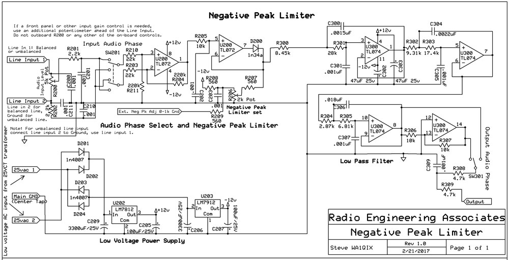 I've heard a lot of Flexes and modified SSB rigs that have balanced modulators on the air - and they can sound really great except for that "folding back" problem when one hits 100% negative modulation. The negative peak limiter takes care of all of this, allowing lots of audio on the carrier without the resultant "overmodulation" distortion. The low pass filter prevents "splatter". As I said earlier, this is the identical N.P.L. and filter as is used in the class E rigs, so the audio quality is not diminished at all.