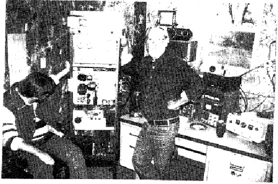 Don Scott, WA4UGR (right) is shown with his son Tim, KD4DVH (left) at the ham station. Right to left is shown ths Johnson Valiant, SX-71 receiver, homebrew 813 amplifier, scope, wattmeter, antenna tuner. FTlO1EE, homebrew antenna tuner. "757 slopbucket rig and power supply. The rig in the tall cabinet is a homebrew 4lOOOA final with a pair of 813s connected as zero-bias class-B triode modulators.