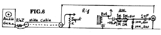The preferred layout is in Figure 6 to start with an audio signal generator. Connect it through an R = your input R of your mike circuit, typically still 500,000 ohm to 1 M ohm to G. Notice that we need to include your entire mike cable, due to its significant C value, undesirabley bypassing treble to G. The rig is out of your cabinet. Pull your rigs AC plug. Use the same socket for your soldering tool, so that you can not have them both plugged in at once.