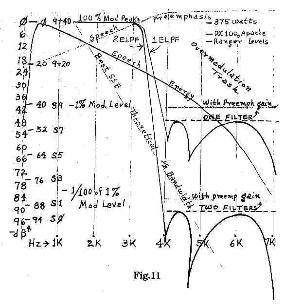 Notice in Figure 11, that the comparison with S Unit values is letting us see what we can do. While our voice strength, above about 400 Hz, goes down at about 6 dB/O, our Preemphasis, at about +6 dB/O substantially corrects this to "flat" between about 300 Hz and 3,200 Hz. What looks like a vertical line from the top, near 3,300 Hz, down, is actually the remarkably steep cut off by W3NQN's filters. Compare this with the Receiver S Unit Scale, on the left. We see that a strong AM signal, at S9 + 40 dB, could have voice energy, or trash, out above 4,000 Hz, at, say, one ten thousandth of this carrier level. That would be at S9. That trash would slope down at frequencies higher than 4,000 Hz away from the carrier. For several channels above and below this, no signals of S9, or less, would be readable. Unfortunately many AM operators have much heavier trash than this and will end other contacts, by unfortunate trashing, as far off as ± 20 kHz of his carrier.