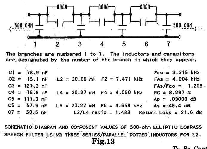 I contacted Ed, W3NQN, about my problems, and he offered to help me to help you. He uses a special BASIC program with an IBM-compatible computer to calculate the component values and performance parameters of the "7th-order elliptic lowpass filter" (ELPF) shown in Figure 13. (The BASIC program used to calculate the ELPF was derived from a program published in the May-June 1988 issue of EMC TECHNOLOGY, Vol. 7, #4.) This particular design was selected so that the inductor values could be realized with combinations of the commonly available surplus "22-mH" inductors.