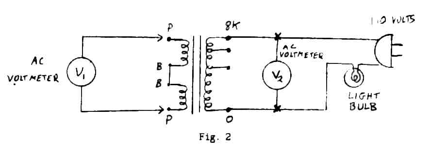 1. Connect the transformer, light bulb and line cord as shown in Fig. 2. The purpose of the bulb is to protect the circuit by acting as a current limiting resistor in case of a defective transformer winding or inadvertent short circuit in the test set-up.