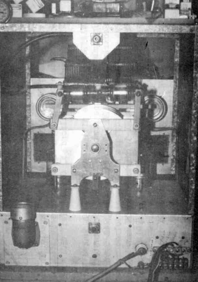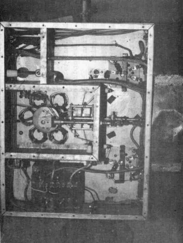Rear view of the RF deck shows the butterfly variable plate tuning condenser. The plugin plate tank coil is mounted above, along with fixed vacuum capacitors to extend the low frequency coverage.