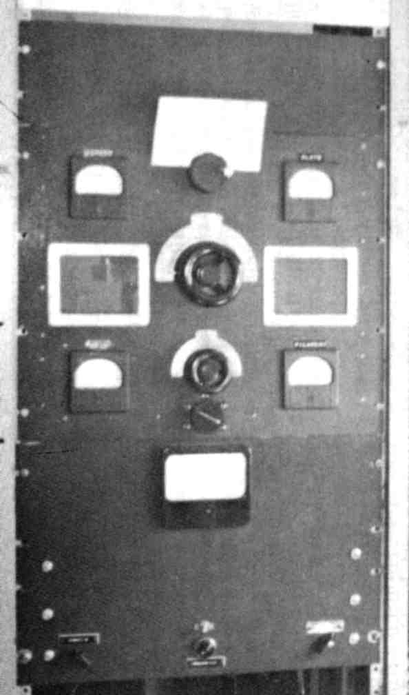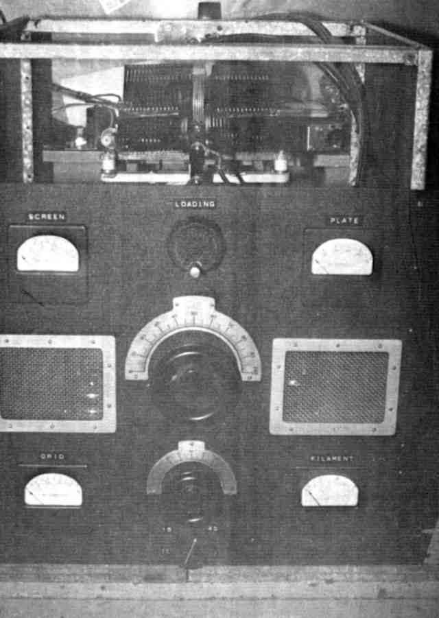 Close up view of RF deck. In the space above the front panel, the kilowatt plugin coil with swinging link is visible. The meters read plate current, screen current, grid drive and. filament voltage. The final tubes are visible through the screened openings in the front panel.