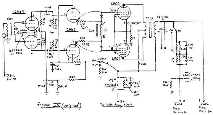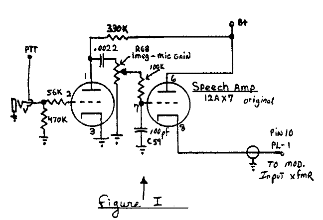 Now we can start on the modifications.... Speech amp. This is a common amp with a cathode follower, low-z down the multi-cable to the modulator deck/power supply. Figure I is the original circuit.