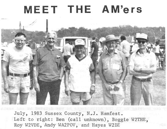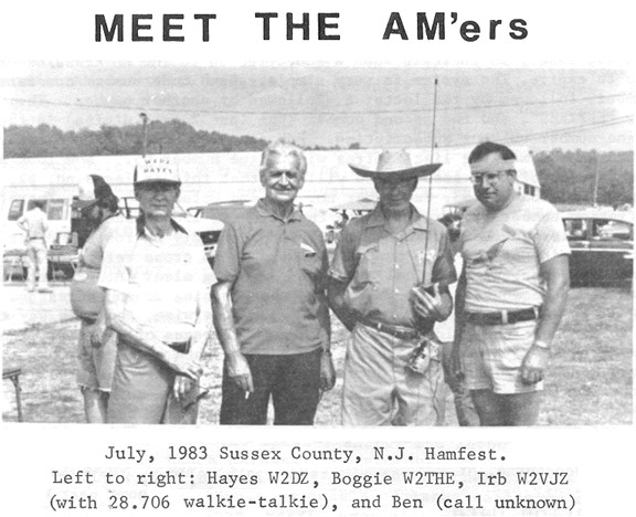 I am sorry to report that Boggie, W2THE passed away in February, but happy to sign with, "WELL DONE GOOD AND FAITHFUL SERVANT!" In July of '83 I met him for the first time at a hamfest in Sussex Co. in North Jersey. While we were talking, a young SWL came up and said, "I recognize your AM voices. Aren't you Boggie and Irb?" How often does that happen? About a year later I met Boggie in person again during one of his long fishing trips to Canada. Early one morning up in the Adirondacks he was driving by and again we had a memorable eyeball.