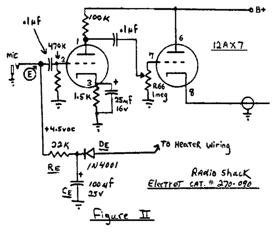 In fig. II, the frequency response is widened and the gain increased, and an option is also added to use an electret condenser element microphone using 3 additional parts as indicated. Connection is made at E and any suitable heater wiring that is close by. The end result will be an optimized operating voltage of 4.5 vdc for the electret element. The element can be seated in a chunk of styrofoam in an old mic housing or anything handy. You can however choose not to use this and not use Re, Ce & De, then you would plug in a Hi-Z mic to the jack, using a stereo plug as the PTT voltage for the relay is also provided there.