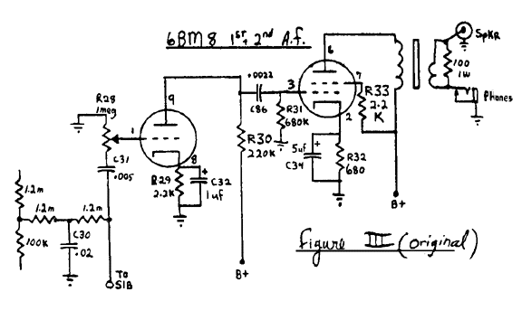 The AF output also needs some work, in fig. III you will note the original circuit, change the following for more gain, less distortion and better frequency response: C30 to 470pf, C31 to .05 uf, C32 to 25 ufd 16v, R30 to 100K, C86 to .1 uf, R31 to 470K, R32 to 220 ohm 2 watt, C34 to 25 uf 25v, and last but not least, R33 to 6.8k.