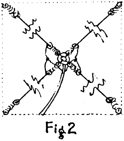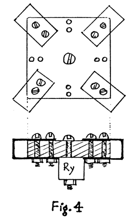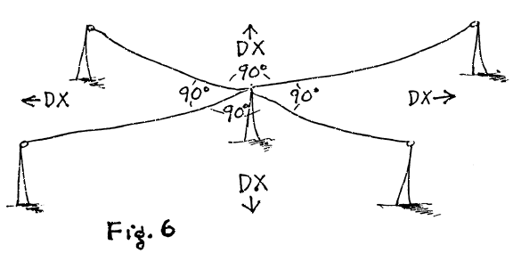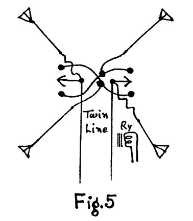 Part 7 THE BEST LOW FREQUENCY ANTENNA TO FIT YOUR LOT In the 1950s and 1960s, I was looking for broadbandedness. Then I was looking for pattern switching, without retuning. I found those. I also found reduced fading depth (incoming spontaneous reports), switching to avoid fading and extreme DX enhancement, beyond 5,000 miles. Now you can have these too. THE SQUARE DIAGONAL (acreage counts) The name comes from this: draw a square with dotted lines. Now, with solid lines, draw the diagonals across, from opposite corners. These lines are crossed at exactly 90 degrees. From the center, the feed point, there are four identical elements. The optimum element lengths are anything over one foot per meter of wavelength, but less does work according to size and takes more tuning. Electric fence wire is cheap, and it shears off sleet. It is strong and inconspicuous at #18 wire size. You need protective goggles (beyond eyeglasses) when handling it. Always bend raw ends into a "9" safety loop before letting go of an end. Do not carelessly release the unused end of a roll of this wire. It will snag and take all day to unwind. Any kink in the wire, when unkinked, has crystallized the wire. It will rust and break there. Discard that piece. Remember to keep all children and curious away. WHAT YOU GET Keep reading if you want an antenna with the most signal collection area, the most diversity against fading possible, with four DX patterns, smooth tuning and loading on all the spectrum higher than its lowest frequency, all fitted to your antenna area. I hope that you can enjoy a Bonadio Square Diagonal Antenna. BALANCE The balance of element lengths, including the ties onto insulators and any relay is extremely critical in order to have identical load resistance and phase reactance on each fed end of all 4 elements. Cut, tie and solder on a rack, in the field, as in Figure 1. Generally, if each of the four elements are under 85 feet on a leg, only four supports are needed. If over 100 feet, a fifth support may be needed at the center. However, elements may extend for great distances if supported every 200 feet. As shown earlier in this series, ground shunt wires are very desirable, making +2dB, or 60% more signal strength. MORE PICTURES Figure 2 shows an unswitched version using eight insulators and a large washer from a hardware store. A measurement from any pole should be identical to the two adjacent pole's distance. Tested from each pole, this will prove the perfect square. Fed with twinlead, the jumper wires must be equal in all four paths. I used the Belden KW Twinlead as in Figure 3, with a screw through the two layers of plastic, covered by layers of tape. It was still good after 13 years. Figure 4 shows the 1/2" thick Plexiglass 5" x 5" insulator that I had made up with stainless steel hardware. I now use two SPDT vacuum relays with my 1,500 watts PEP there. Figure 5 is the electrical circuit for a 90 degree pattern change relay. Pay attention to the requirement of all four paths needing to be identical. In this drawing, note the extra "S" curves on paths B & D to equal A & C through the relay. Use a d.c. relay, preferably of over 25V coil voltage. Figure 6 is of a large system and if switched it stays in tune at 1:1, but needs a careful layout. WHAT TO DO As all of its standing waves are modest, so modest insulators are satisfactory. A tuner is required such as shown earlier in this series, because this antenna will excellently radiate all harmonics which reach it. Also, for receiving, a tuner will usually eliminate all image signals that could pour in, this being a continuous spectrum antenna. On its shorter wavelengths, it looks similar to a dummy load of 100 ohms with a reactance of less than 10 ohms (a very low figure). Hence, moving across a band often does not require retuning. My original (expired patents) Bonadio Square Diagonal Antenna had elements of 58 feet each in an 80 foot square. It was, in spite of its small size, "excellent" on 40 meters, "very good" on 75 and "good" on 160. Because this system has such low reactance, the wide range of L & C values shown in a tuner in this AM/PE series, are not needed. However, the slidable or swinging link system shown therein, is excellent in harmonic and spurious reduction, in and out. HARD TO BELIEVE "Computer Programs" to calculate antenna results will not predict this system. The separation of 90 degrees does prevent mutual effects among those elements. This ideal two dimensional radiation (broadside) does not bounce from the 360 degree earth, at low angles, 180 degrees from this 2D radiated signal. Hence, extremely low angle radiation persists, in and out - and DX, beyond 5,000 miles, will often tell you (if you ask) that you are the strongest signal from your area, at this time. This is because your (saved) very low angle radiation makes fewer hops to go over 5,000 miles, and there is less loss per hop at low angle reflections. Both of these good effects add up to less losses beyond 5,000 miles. You can get unbelievable reports - but from the other half of the world, not near in, and especially on "poor" days. KNOW WHAT IT DOES If you can put one of these up and still keep your present system, compare them. Run them separately tuned on the same band and switch the coax feed to each tuner. I compared my 58 foot (in an 82 foot square) version, at the same elevation, with my 160 foot long extended dipole, on 75 meters. Only one station, 150 miles away, always was favored by the old antenna, but everyone else preferred (and my receiver confirmed) my Bonadio Square Diagonal Antenna. HOW MUCH, ON AN AVERAGE I estimate the average advantage at both transmitting and receiving (which big bucks equipment can't do) at +6dB (400% power), and with the choice of the better pattern by relay, at an average of +9dB (800% power), a worthwhile investment. It's time to get your paper and pencil out.